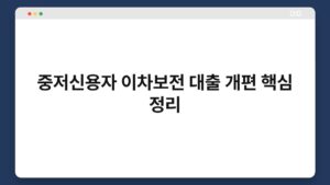 중저신용자에게 대출은 언제나 쉽지 않은 문제입니다. 특히 이차보전 대출 개편이 이루어진 지금 많은 이들이 변화에 주목하고 있습니다. 이 글에서는 중저신용자를 위한 이차보전 대출의 핵심 사항을 정리해 보겠습니다. 변화된 정책이 어떻게 도움이 될 수 있는지 그리고 ...